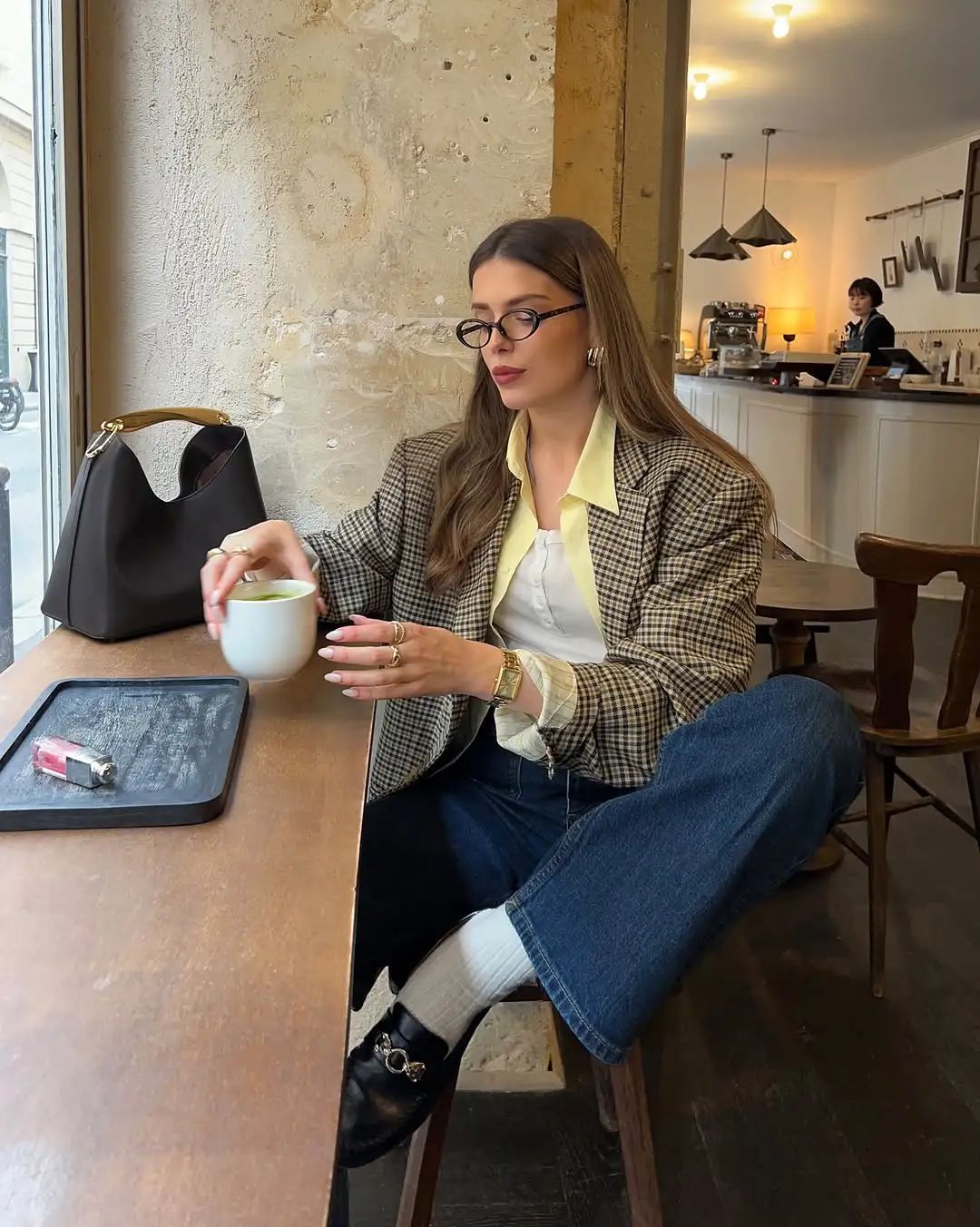 不少时装博主还会在毛衣+衬衣的基础上搭配迷你裙,并且加入短袜,搭配乐福鞋或者平底鞋,让“学院风”看起来不那么“乖”,打造一种带有反叛的先锋气质。