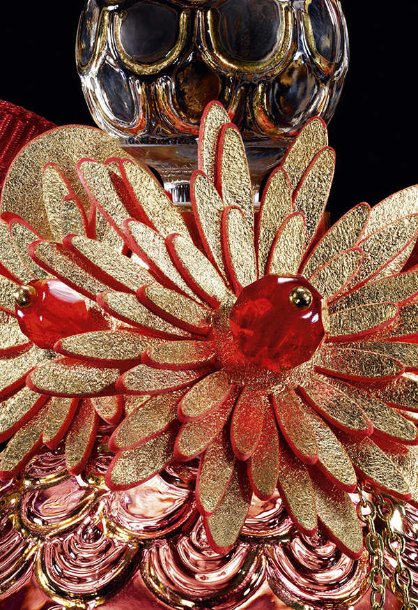 每一片花瓣被轻柔安置于镀金花枝之上,顶端以一颗棱面红色玻璃珠点睛。精准与诗意,在此刻达成无声平衡。