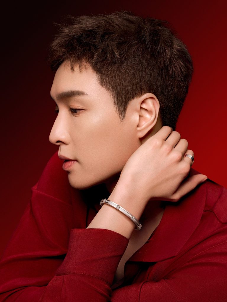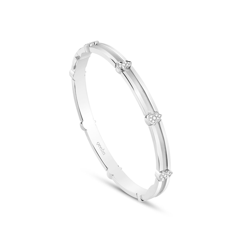 全新手镯有18K白金与玫瑰金两种材质可供选择,八颗镶钻Wulu轻盈排布,凝萃圆满的东方寓意。精髓隐于一道贯穿镯身的凹槽:凹底覆细腻喷砂,质感若敦煌神秘金沙;凸缘则以镜面抛光,光澈如鉴。二者精妙交织,托起Wulu悬浮在明暗交界,随姿态折射星芒微光。直线凹槽与弧面闪钻刚柔相济,恰似“天圆地方”的和谐诗章,于金工韵律中绽现深意。
