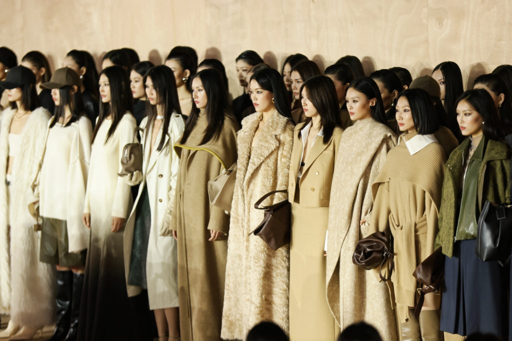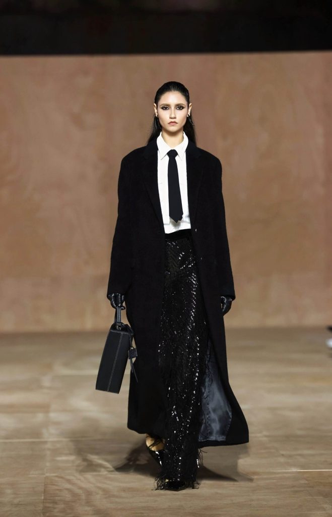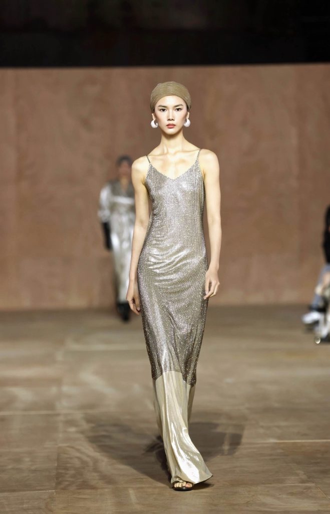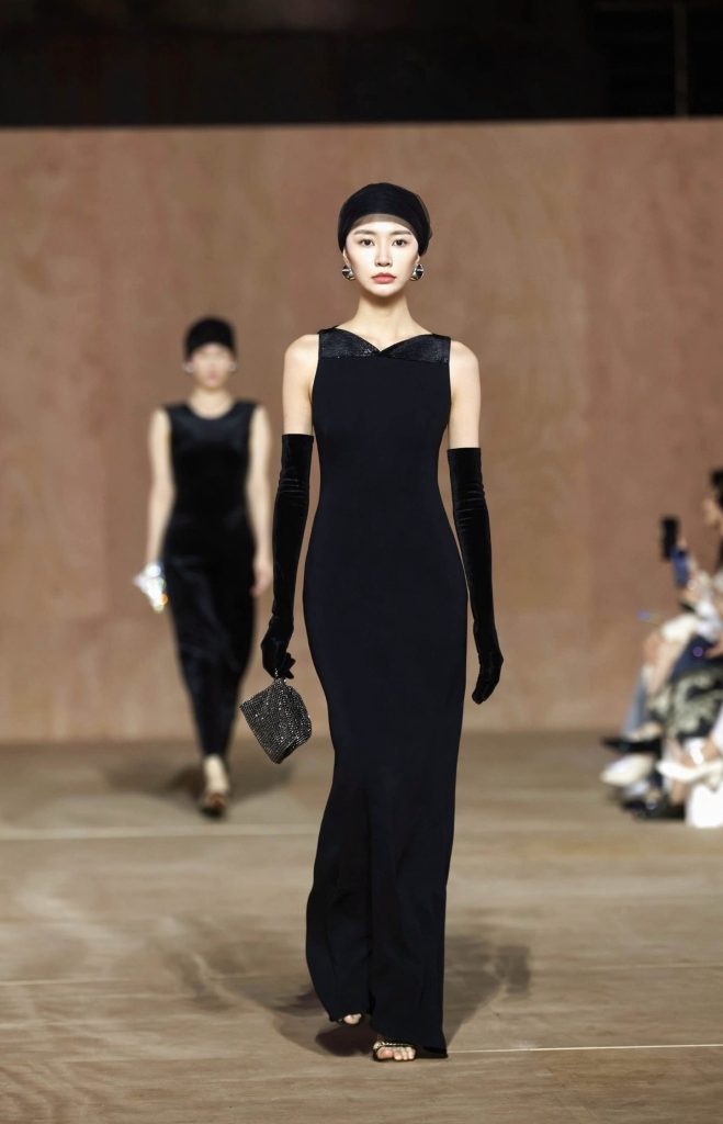 大秀以一副脚踏实地、自在洒脱且不断重塑自我的女性群像演绎呈现。采用独特演出形式展现出女性在不同场景下的状态、和对面人生的多种处世的姿态。本场大秀以一系列原始肌理与包裹感廓形设计开启,通过模糊边界的设计语言,诠释女性回归本质、聆听内心律动的本真状态。柔软材质与亲密剪裁相得益彰,彰显“温柔即力量,亲密即反叛”的设计哲学。随之,精湛的剪裁与利落线条成为焦点,以精准的轮廓掌控和动静平衡的设计,展现出现代女性收放自如、果决前行的精神内核。整场大秀在立体轮廓与灵动垂坠设计中渐入高潮,寓意女性内在力量的迸发与自信光芒的绽放,完整呈现了朗姿女性从容独立、忠于自我的觉醒姿态。