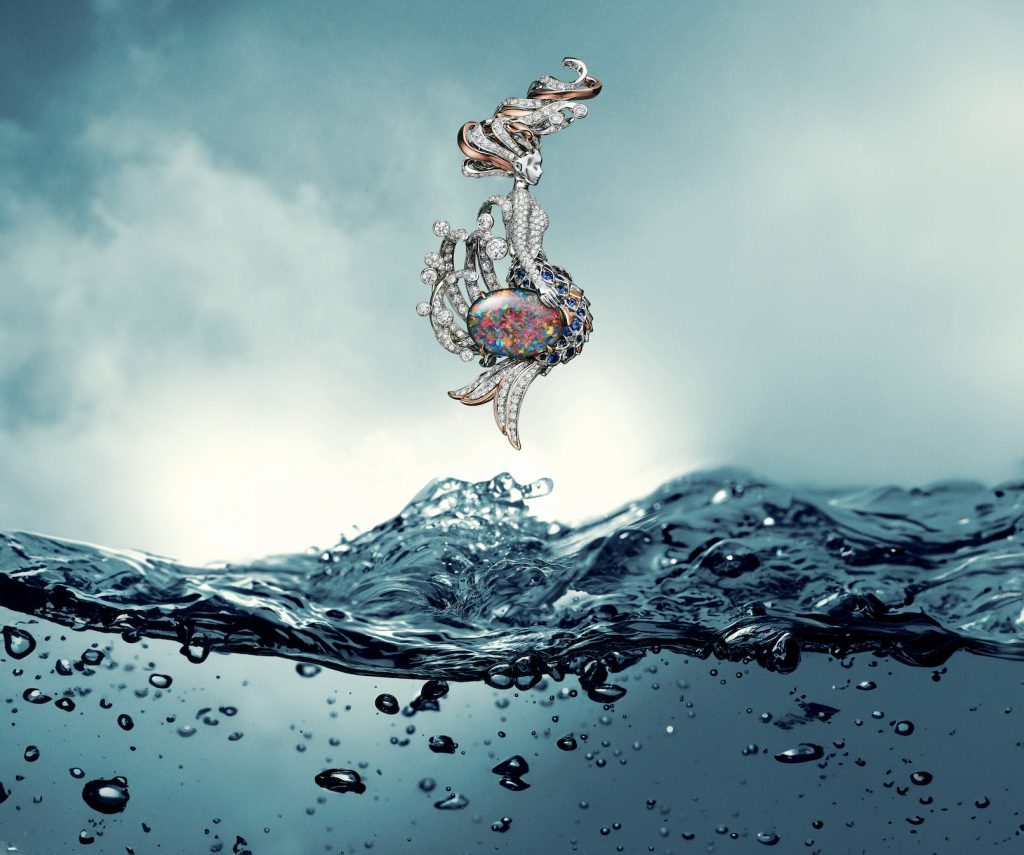 海灵仙姿(Mermaid)主题以传说中的美人鱼为灵感,通过Nathalie 2026世界杯转播网站 世界杯2026网络直播 2026世界杯转播网站 Verdeille极富想象力的视角,完美诠释这一神秘生灵的独特魅力。其中,一款以铂金与玫瑰金打造的镶钻胸针,生动勾勒出美人鱼的灵动身姿,鱼尾处则点缀一颗重逾10克拉的黑色欧泊。同时,该主题亦呈现多款造型丰富的戒指、耳环与项链作品,每件珠宝皆是对神秘深海的礼赞。