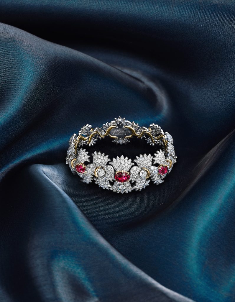 灵感源自让·史隆伯杰一系列妙趣横生的海葵胸针设计,花舞海葵(Anemone)主题作品洋溢着灵动韵律与绮丽妙想。该系列中的焦点之作是一款华美的项链,充满雕塑感的黄金元素与璀璨钻石交相辉映,三颗总重近5克拉、未经优化处理的红宝石则进一步为作品注入鲜活生命力。这些红宝石均产自非洲莫桑比克的知名矿区,非凡的色泽与品质令它们宛如灵动舞者般在项链中流转生姿。