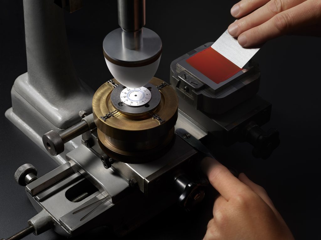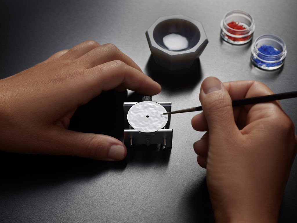 接之便进入精加工阶段。先用纸玻璃打磨白色表盘,使其达到绝对平整,便于实现釉料玻化。720°C之下,一连慢火烧制十次,不仅可形成坚固明澈的釉层,更可使饰面格外亮丽、流光溢彩,散发乳白莹泽,同时兼具唯有手工珐琅技艺才能创造的独特丰盈感与层次感。