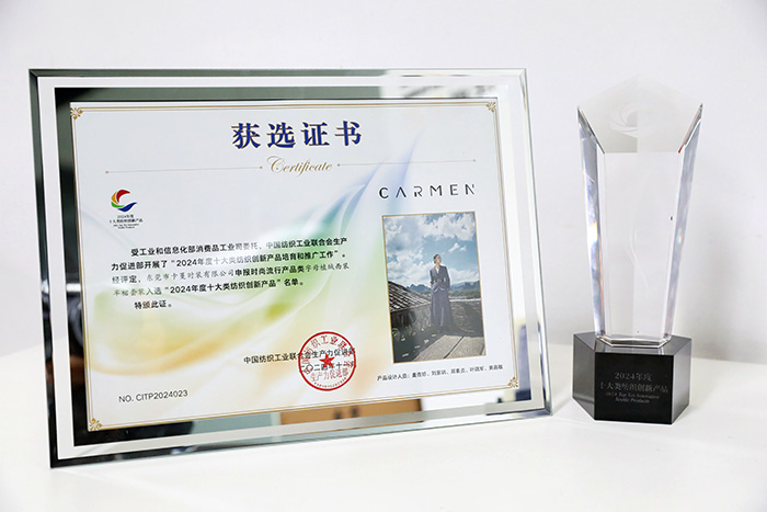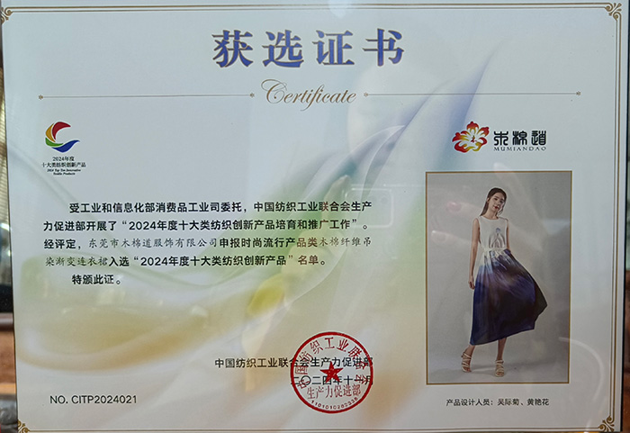 大会期间,虎门卡蔓、木棉道分别以“字母植绒西装半裙套装”、“木棉纤维的植物染色及手工工艺连衣裙”入选“2024年度十大类纺织创新产品”。